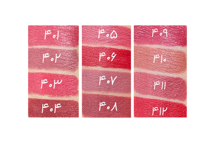 این رژلب در ۱۲ رنگ متنوع از کد ۴۰۱ تا ۴۱۲ موجود است تا بتوانید رنگ مورد علاقه خود را انتخاب کنید.